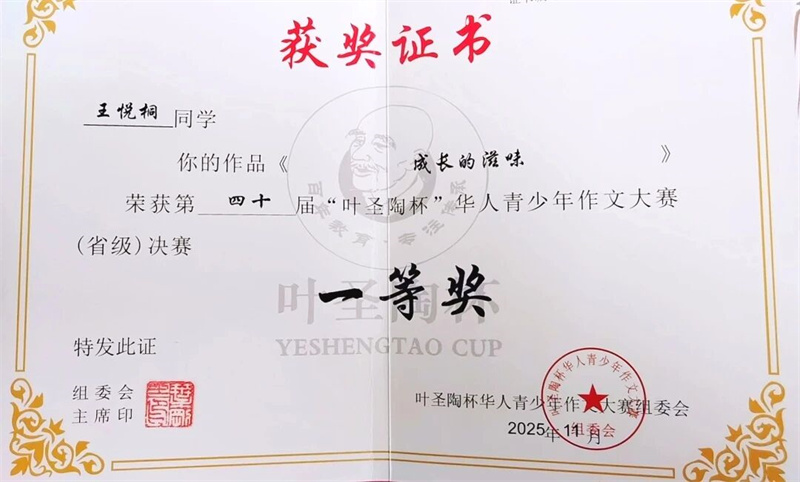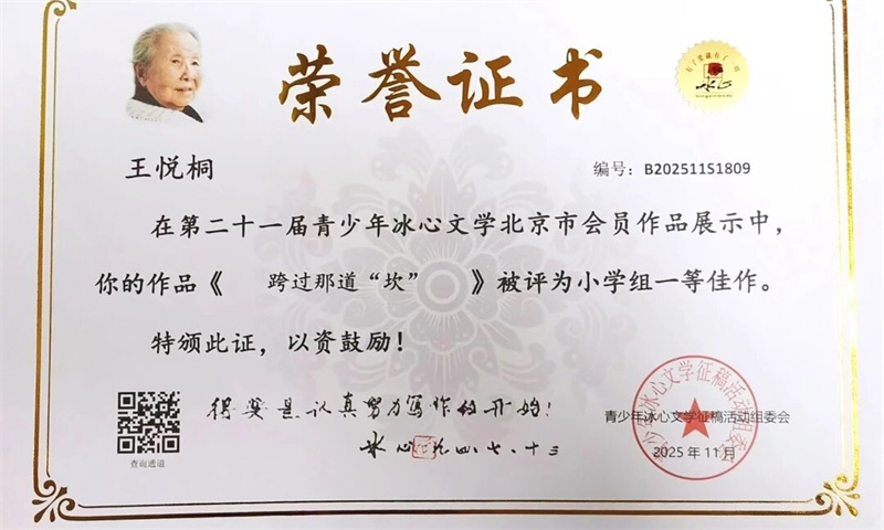 王悦桐同学在全国中小学生作文大赛与第二十一届青少年冰心文学北京市会员作品展示中摘得一等奖殊荣;翟杏琴老师荣获优秀指导教师奖。