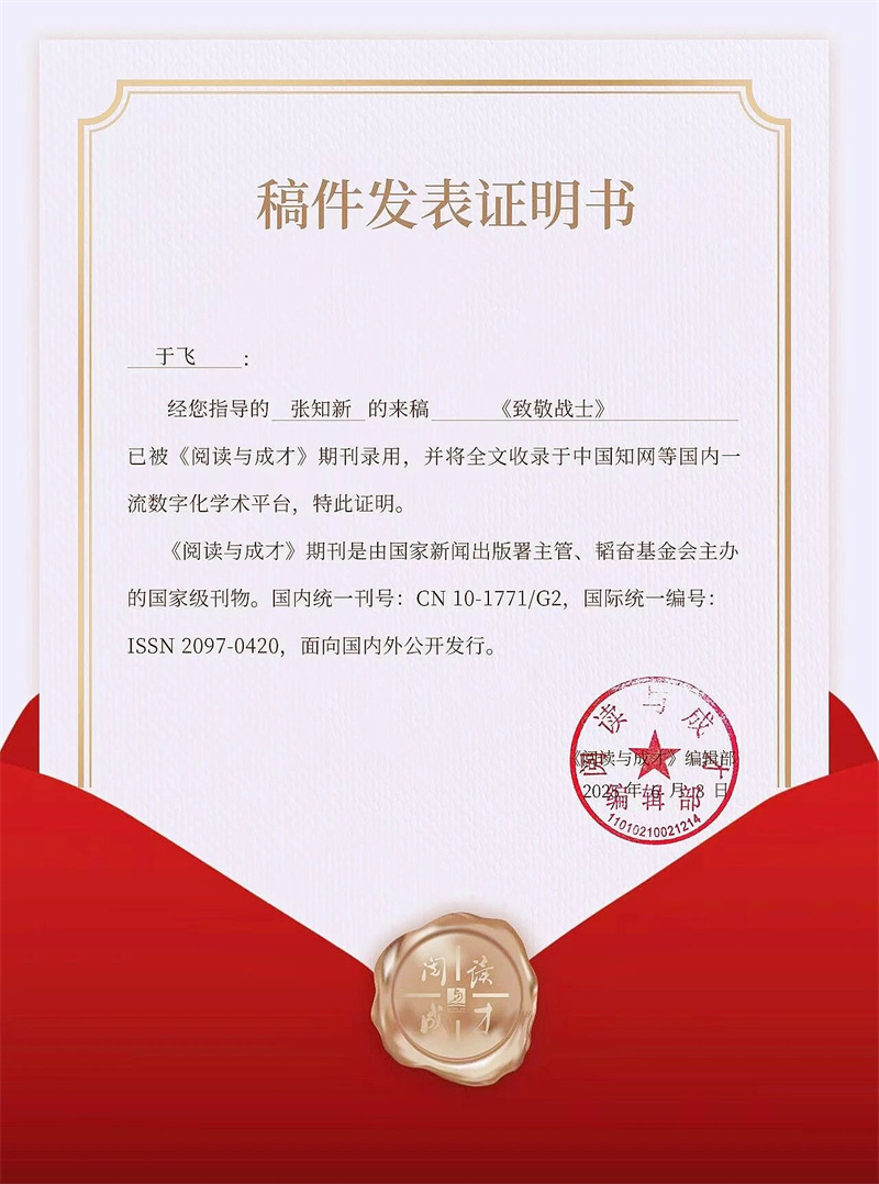 精诚学子张知新、张云逸诗歌作品、于飞老师学术论文被国家级刊物《阅读与成才》录用,后续将全文收录于中国知网等国内一流数字化学术平台,实现教学成果与学生文学创作的权威刊发与广泛传播。