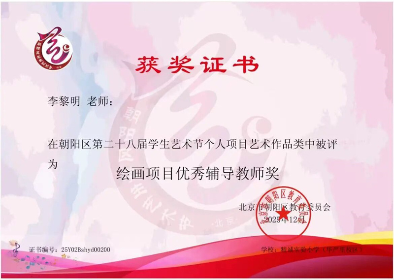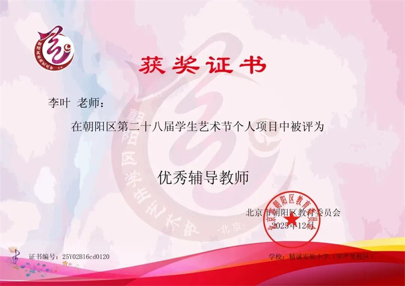 在朝阳区第二十八届学生艺术节个人项目评选中,精诚学子们以过硬专业素养彰显实力,以多元艺术表达展现风采,在朗诵、舞蹈、绘画、器乐比赛中多维绽放,揽获一二三等奖多项奖项。李叶、李黎明两位老师荣获“优秀辅导教师”荣誉称号。
