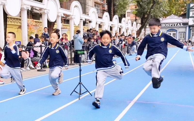 "砰!"随着清脆的鸣枪声划破长空,各项比赛如火如荼展开,孩子们以秋风为号角,在蓝黄相间的跑道上奋力奔跑,书写属于个人与集体的运动诗行。