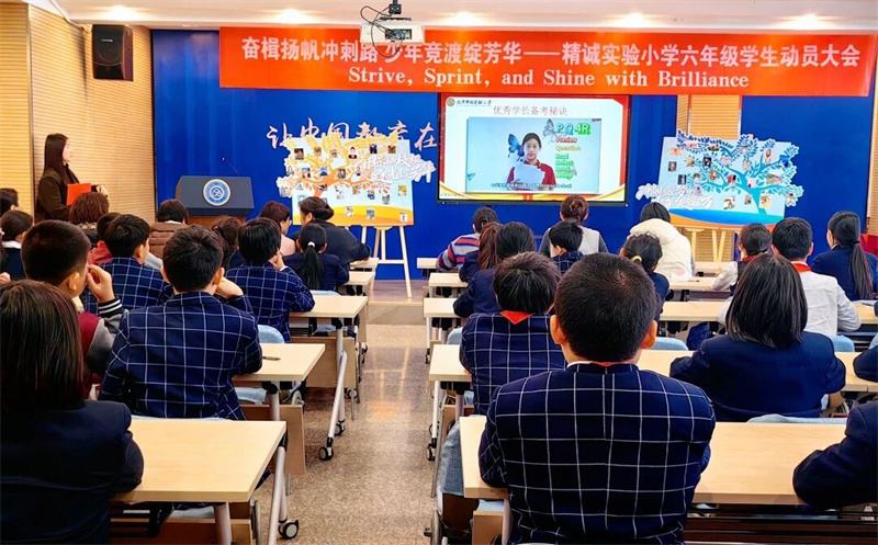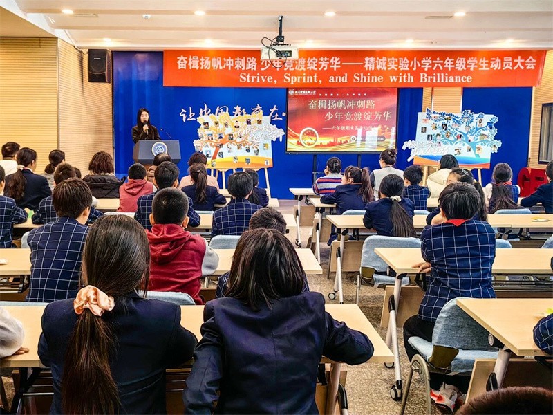 六年级全体师生齐聚一堂,以昂扬的姿态擂响冲刺的战鼓,以澎湃的豪情点燃决胜的信念。精诚实验小学党支部书记刘惠兰、副校长周娟出席大会,与师生共同擘画期末征程的奋斗蓝图。