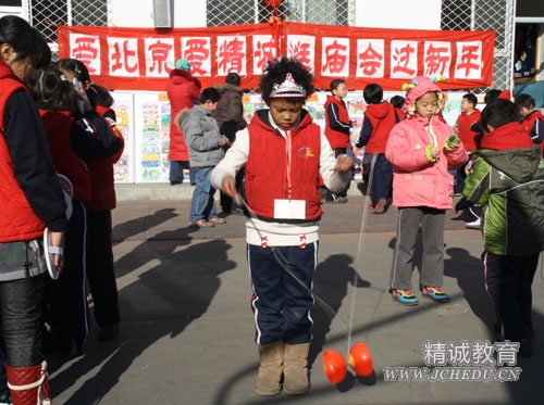 牙买加籍学生余佳璇(中)刚刚学会抖空竹 今年的新游戏“弹弓打板”受到了同学们的“热捧” 好玩的民俗游戏、好吃的民间小吃,这些活动一直是北京庙会的传统节目。而在精诚实验